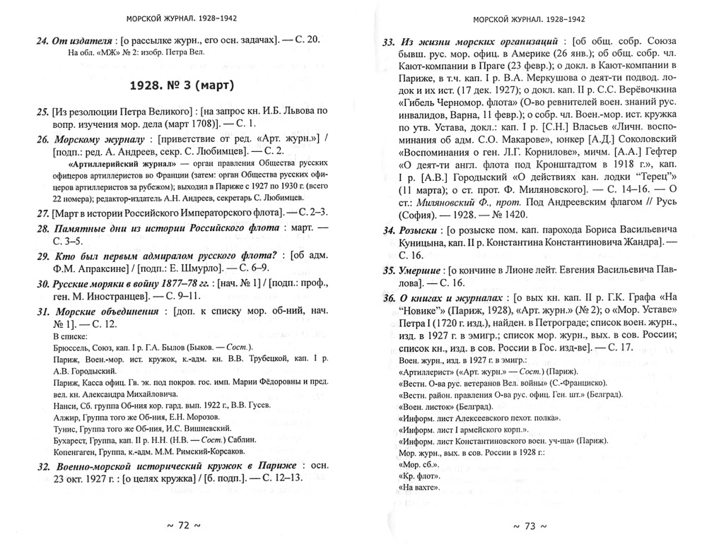 С 1928 по 1942 г. в Праге, под редакцией лейтенанта М. С. Стахевича, выходил «Морской журнал» — одно из главных изданий русской военной эмиграции в 1920–1940-х гг. В библиографическом указателе приводится описание всех публикаций, напечатанных на страницах "Морского журнала" в 1928-1942 гг. по хронологии их размещения в каждом номере журнала. В ряде случаев здесь же приведены исторические справки, рассказывающие об упоминаемых событиях, кораблях, организациях и т. п.
