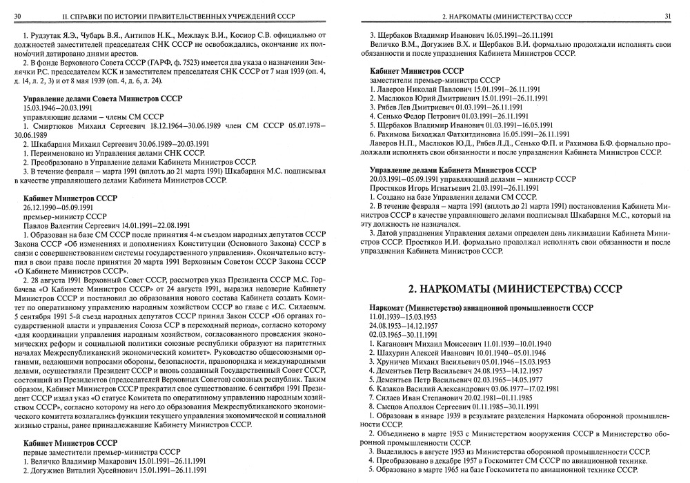 Справочник включает в себя очерк по истории союзного правительства, исторические справки о руководящих органах Совнаркома, Совмина, Кабинета Министров СССР, о государственных учреждениях, чьи руководители в 1923-1991 гг. входили в состав правительства СССР, а также биографические справки всех членов правительства с 1923 по 1991 гг.