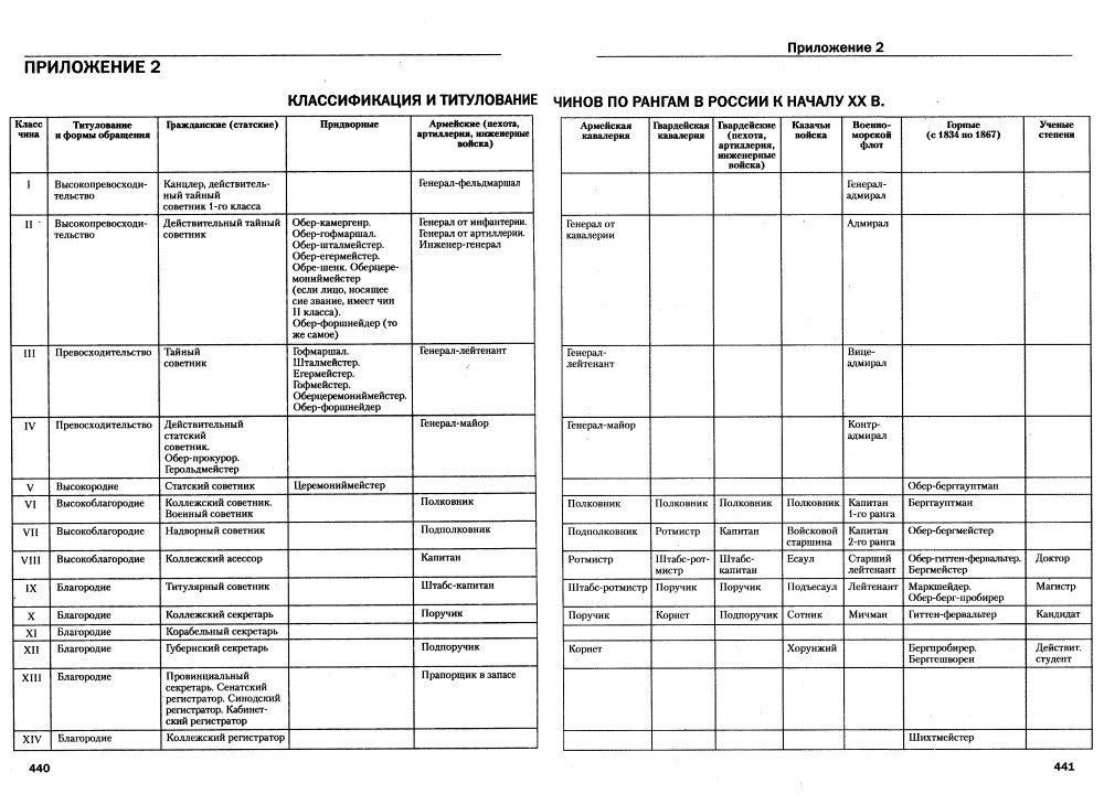 В приложениях представлены табель о рангах, классификация и титулование чинов по рангам в России к началу ХХ в., формы обращения, принятые в обиходно-бытовой и официальной сферах общения в России до революции 1917 г.