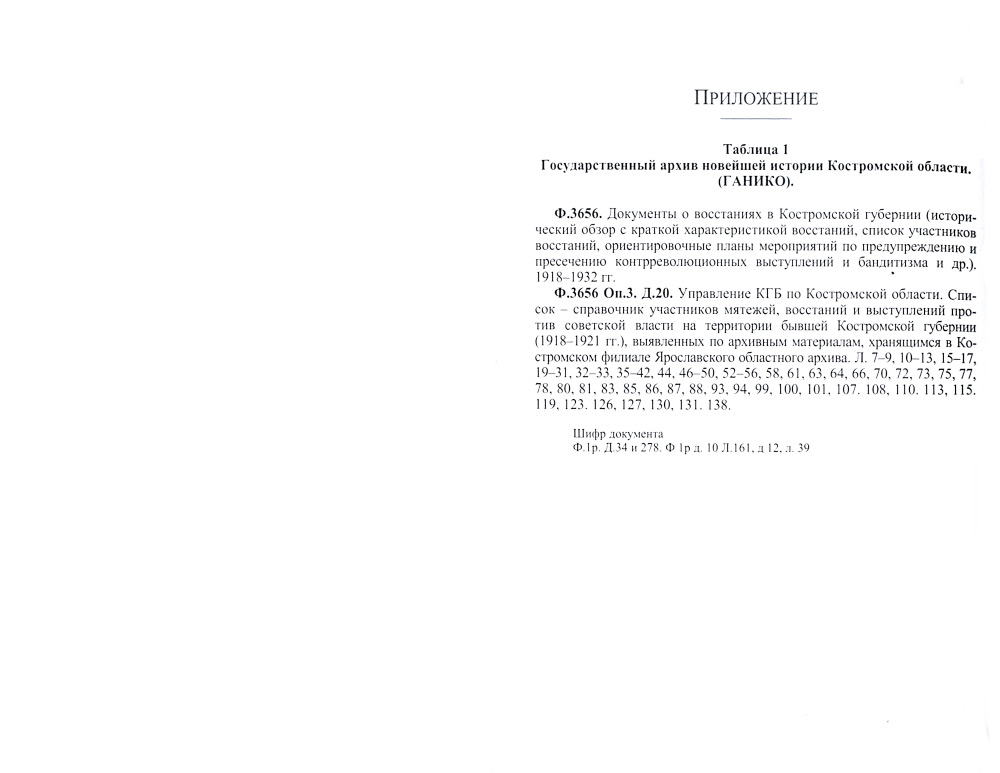 В конце книги помещены две таблицы, одна из которых подготовлена Управлением КГБ по Костромской области в 1950-е гг. и имеет оригинальное название «Список-справочник участников мятежей, восстаний и выступлений против Советской власти на территории бывшей Костромской губернии...», а вторая представляет собой значительный массив кратких биографических сведений о комсоставе антоновских партизанских армий" на Тамбовщине.